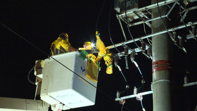 2月7日清晨1点20分,石江镇江潭村江树线号杆处,仍是一片如火如荼的现象。全部预备就绪,在强光照明灯的照射下,跟着带电作业车斗臂慢慢升起,在10多米的高空,“全副武装”的作业人员慢慢向作业点接近,作业人员在高空的作业斗内,慎重专心地做好绝缘防护、替换“发热”设备……一道道作业流程谨慎有序。