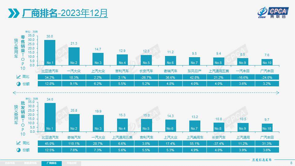 从厂商零售销量排名来看,12月零售销量排名前十的车企分别为比亚迪、一汽-大众、上汽大众、吉利汽车、长安汽车、奇瑞汽车、东风日产、上汽通用五菱、一汽丰田和广汽丰田。